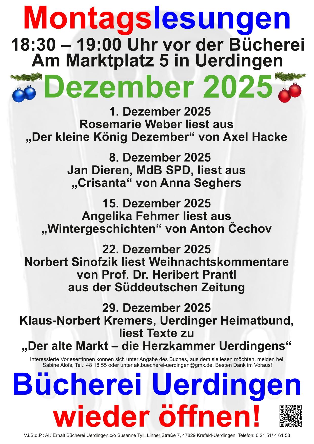 Montagslesungen 18:30 -19:00 Uhr vor der Bücherei, am Marktplatz 5 in Uerdingen.
