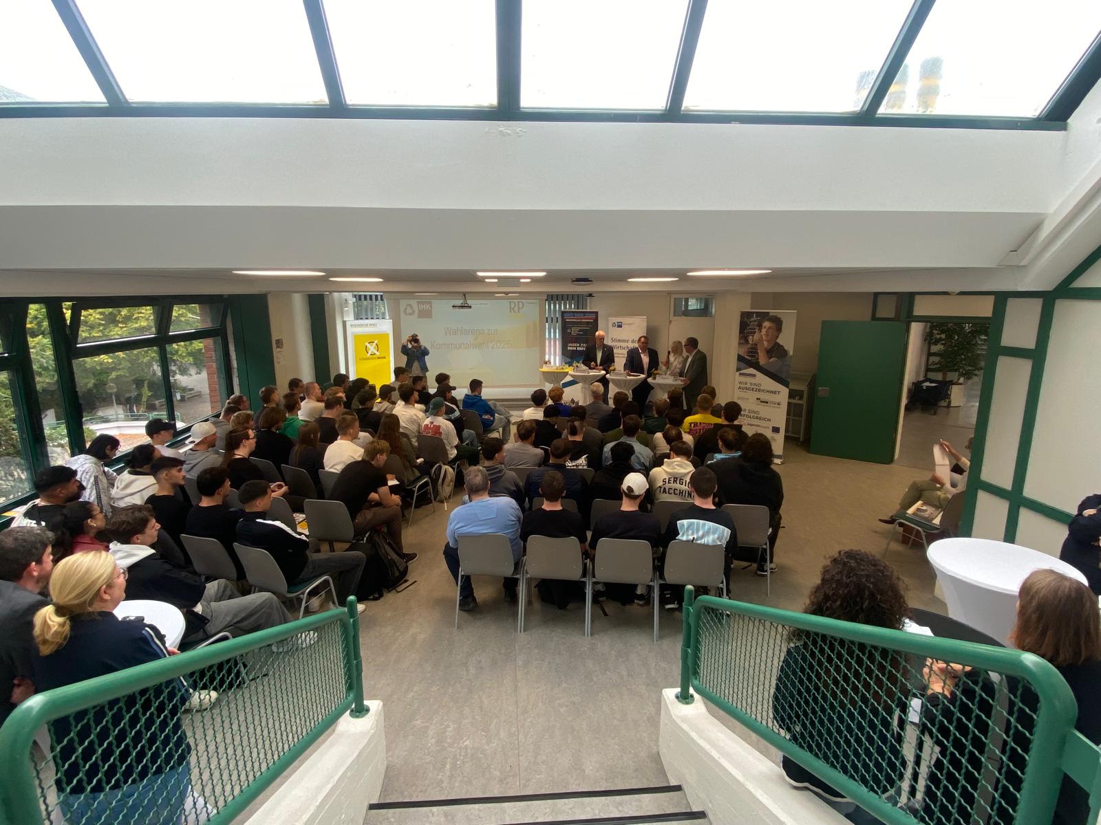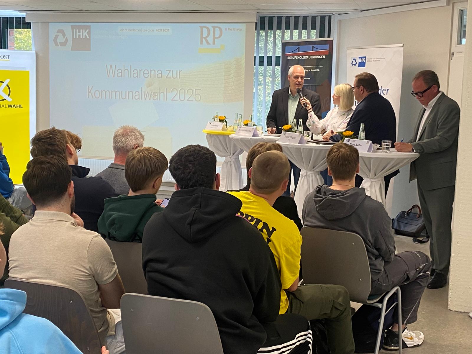 Junge Wahlarena am BK Uerdingen. Die IHK hat es organisiert, die RP moderiert, die Schule inhaltlich vorbereitet… es ging um Industrie, Fachkräfte, Standortfaktoren ( Wohnen, Freizeit, Sport,..) aber auch um kaputte Straßen, Investitionen und undichte Dächer. Der Einladung eines Schülers, eine „Baustellenrunde“ zu drehen wurde angenommen… mal schauen ob Taten den Worten folgen, vielleicht trägt auch ein Trinkwasserspender zur Verbesserung des „Schullebens“ bei. Coole Veranstaltung.